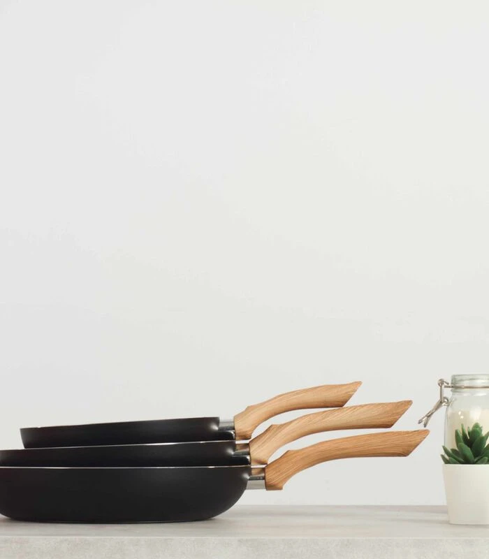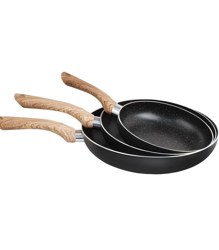 Antikleef stenen coating uiterlijk 20, 24 and 28 cm. Hittebestendig zacht aanvoelend, met siliconen gecoat bakelieten handgreep. Compatibel met inductiekoken. Niet nodig vet toe te voegen.